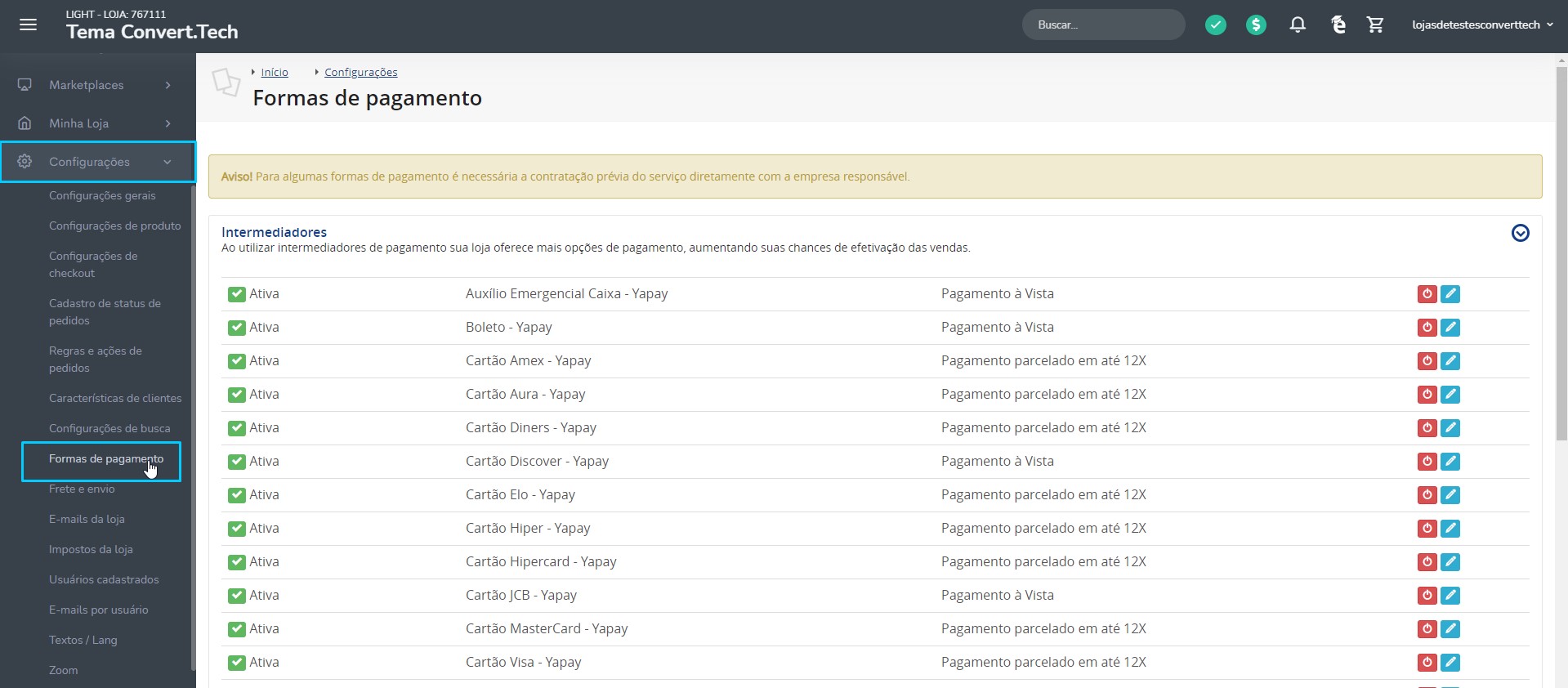 Outra parte importante de todas as lojas são as Formas de Pagamento. Cartão de Crédito, Débito em conta e boleto bancário são as mais utilizadas hoje em dia por dezenas de lojas. Para configurar as formas de pagamento que serão aceitas pela sua loja acesse Configurações > Formas de Pagamento.